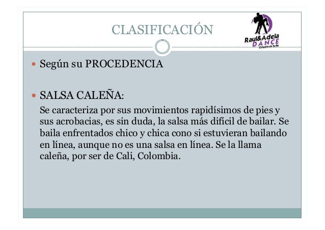- 10. CLASIFICACIÓN Según su PROCEDENCIA SALSA CALEÑA: Se caracteriza por sus movimientos rapidísimos de pies y sus acrobacias, es sin duda, la salsa más difícil de bailar. Se baila enfrentados chico y chica cono si estuvieran bailando en línea, aunque no es una salsa en línea. Se la llama caleña, por ser de Cali, Colombia.