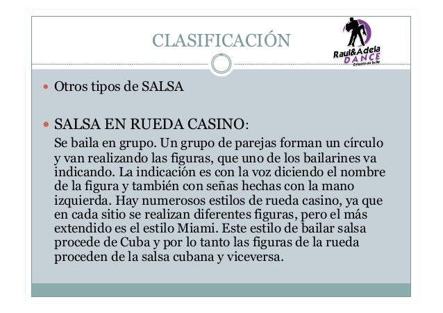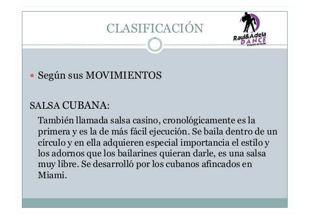 - 3. CLASIFICACIÓN Según sus MOVIMIENTOS SALSA CUBANA: También llamada salsa casino, cronológicamente es la primera y es la de más fácil ejecución. Se baila dentro de un círculo y en ella adquieren especial importancia el estilo y los adornos que los bailarines quieran darle, es una salsa muy libre. Se desarrolló por los cubanos afincados en Miami.