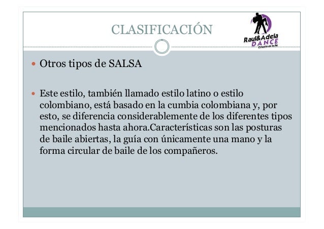- 12. CLASIFICACIÓN Otros tipos de SALSA Este estilo, también llamado estilo latino o estilo colombiano, está basado en la cumbia colombiana y, por esto, se diferencia considerablemente de los diferentes tipos mencionados hasta ahora.Características son las posturas de baile abiertas, la guía con únicamente una mano y la forma circular de baile de los compañeros.