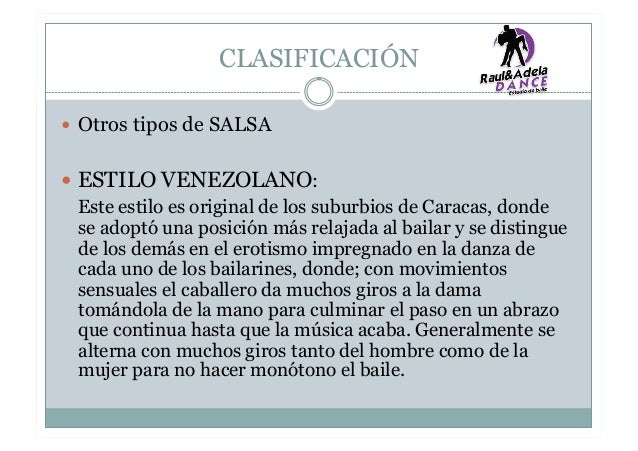 - 13. CLASIFICACIÓN Otros tipos de SALSA ESTILO VENEZOLANO: Este estilo es original de los suburbios de Caracas, donde se adoptó una posición más relajada al bailar y se distingue de los demás en el erotismo impregnado en la danza de cada uno de los bailarines, donde; con movimientos sensuales el caballero da muchos giros a la dama tomándola de la mano para culminar el paso en un abrazo que continua hasta que la música acaba. Generalmente se alterna con muchos giros tanto del hombre como de la mujer para no hacer monótono el baile.
