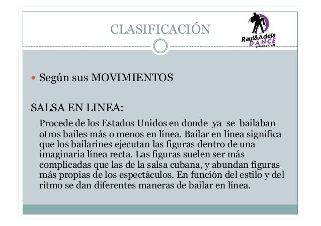 - 4. CLASIFICACIÓN Según sus MOVIMIENTOS SALSA EN LINEA: Procede de los Estados Unidos en donde ya se bailaban otros bailes más o menos en línea. Bailar en línea significa que los bailarines ejecutan las figuras dentro de una imaginaria línea recta. Las figuras suelen ser más complicadas que las de la salsa cubana, y abundan figuras más propias de los espectáculos. En función del estilo y del ritmo se dan diferentes maneras de bailar en línea.