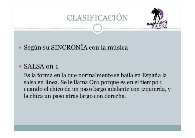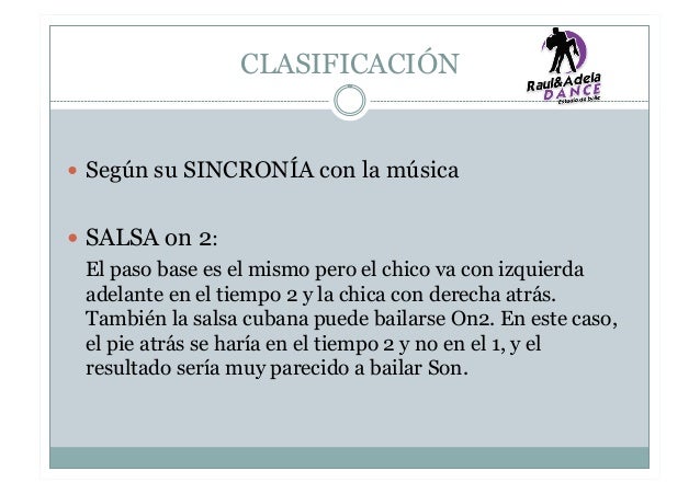 - 6. CLASIFICACIÓN Según su SINCRONÍA con la música SALSA on 2: El paso base es el mismo pero el chico va con izquierda adelante en el tiempo 2 y la chica con derecha atrás. También la salsa cubana puede bailarse On2. En este caso, el pie atrás se haría en el tiempo 2 y no en el 1, y el resultado sería muy parecido a bailar Son.