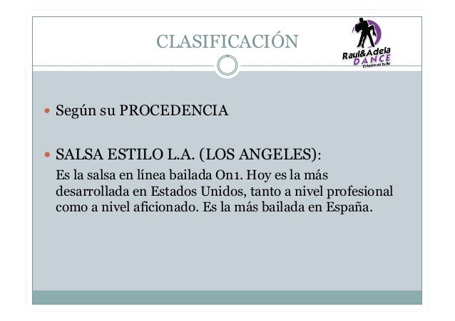 - 7. CLASIFICACIÓN Según su PROCEDENCIA SALSA ESTILO L.A. (LOS ÁNGELES): Es la salsa en línea bailada On1. Hoy es la más desarrollada en Estados Unidos, tanto a nivel profesional como a nivel aficionado. Es la más bailada en España.