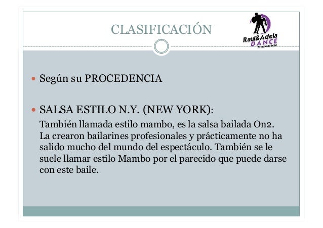 - 8. CLASIFICACIÓN Según su PROCEDENCIA SALSA ESTILO N.Y. (NEW YORK): También llamada estilo mambo, es la salsa bailada On2. La crearon bailarines profesionales y prácticamente no ha salido mucho del mundo del espectáculo. También se le suele llamar estilo Mambo por el parecido que puede darse con este baile.