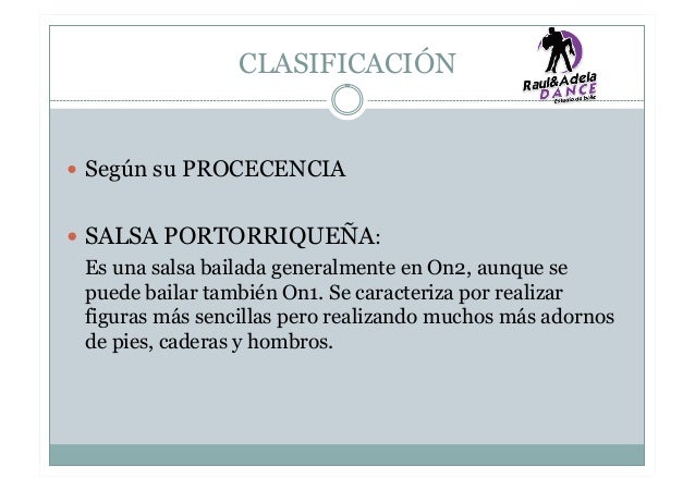- 9. CLASIFICACIÓN Según su procencia SALSA PORTORRIQUEÑA: Es una salsa bailada generalmente en On2, aunque se puede bailar también On1. Se caracteriza por realizar figuras más sencillas pero realizando muchos más adornos de pies, caderas y hombros.